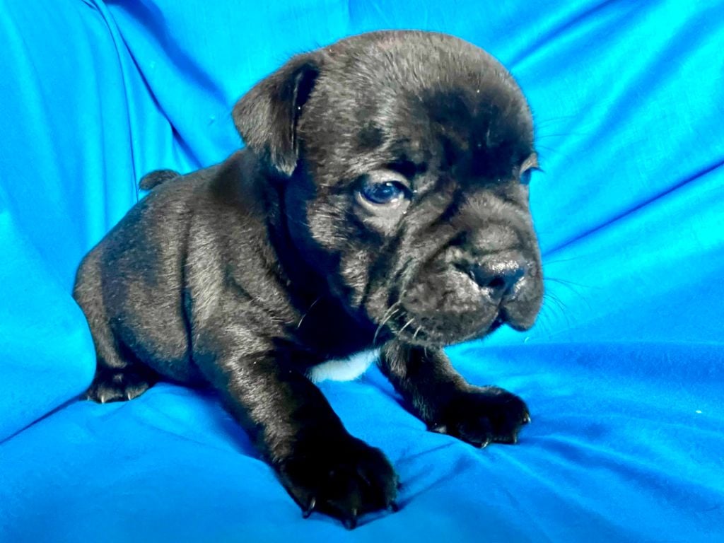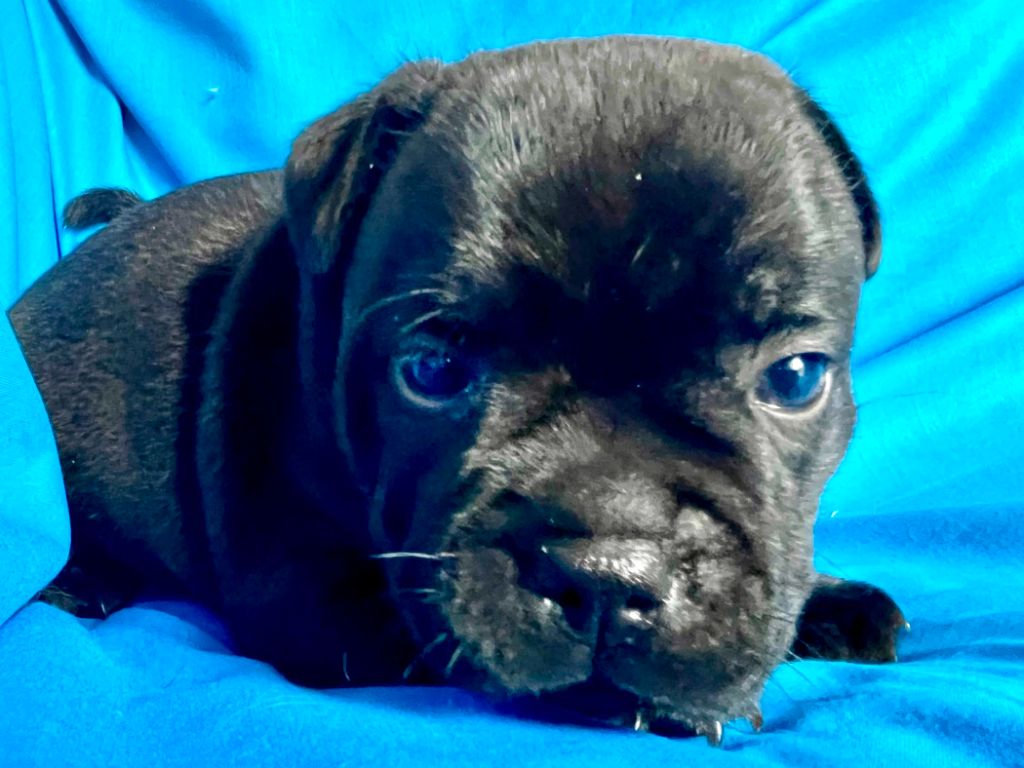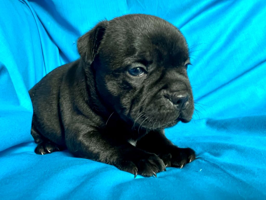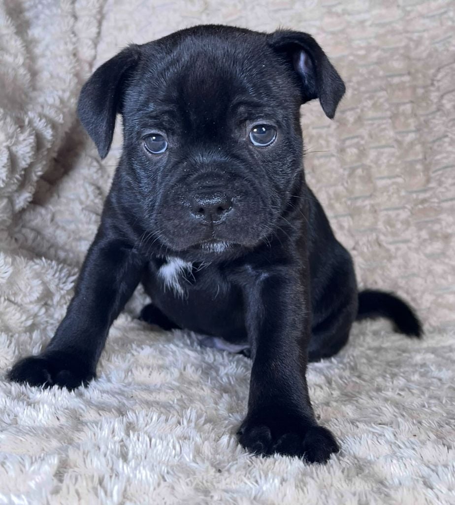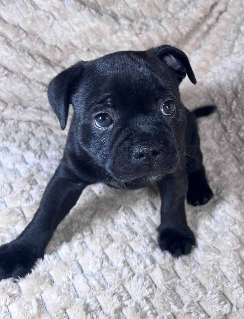 Nous vous présentons avec une grande émotion ce petit trésor noir de jais, un adorable mâle Staffordshire Bull Terrier né le 4 mai 2025, disponible à l?adoption à partir du 4 juillet 2025.